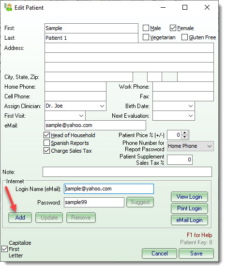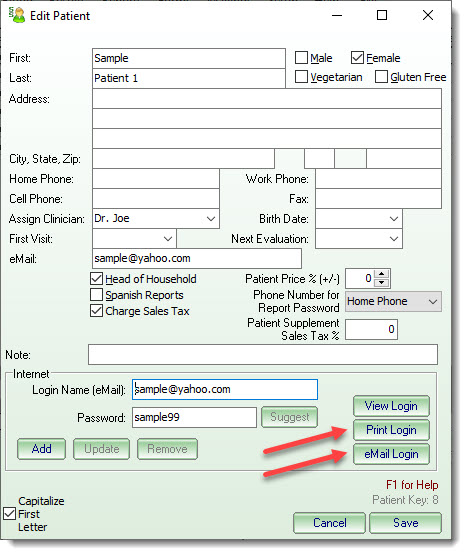 To inform the patient that their account has been created and instructions on how to login, click on the eMail Login (or Print Login if they are in the office)...