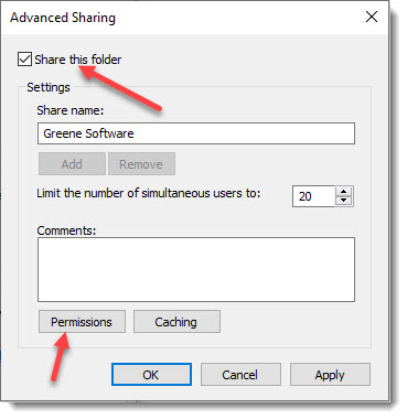 - Turn on the check-box Share this folder, then click on the Permissions