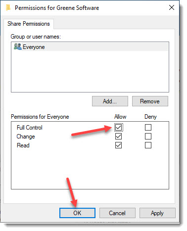 - For the group Everyone, ckeck the box for Full Control / Allow.