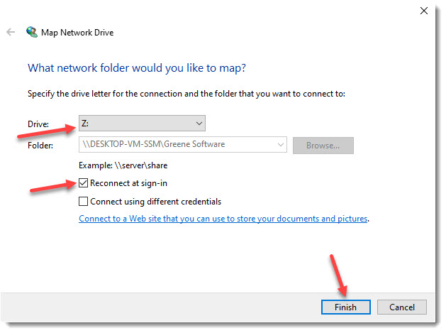 Select the Drive letter, select Reconnect at sign-in, click Finish